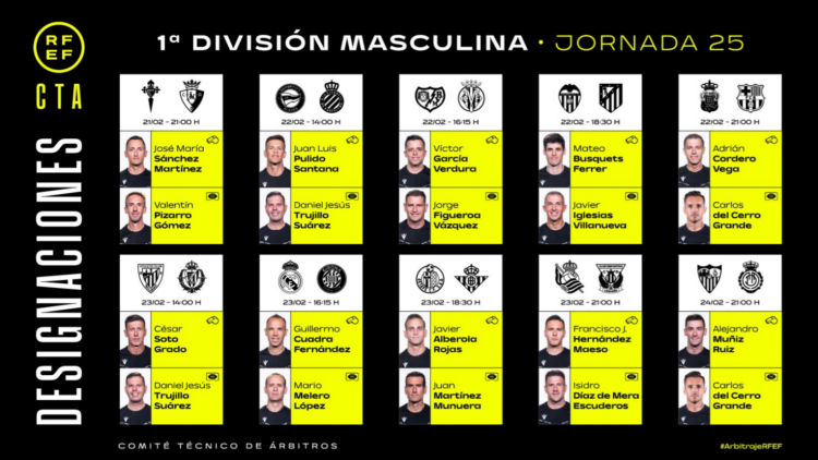 Daniel Jesús Trujillo Suárez será el encargado de ayudar a Pulido Santana desde la sala VAR. El colegiado tinerfeño de 42 años ha dirigido al Espanyol desde el VAR en tres ocasiones esta temporada, donde se han logrado dos victorias y una derrota (Espanyol-Rayo Vallecano 2-1; Espanyol-Villarreal 1-2; Espanyol Valladolid 2-1).