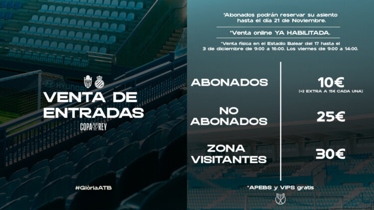 El Atlético Baleares ha puesto en marcha este miércoles la venta de entradas para el partido de la segunda eliminatoria de la Copa del Rey ante el Espanyol, que se disputará en el Estadi Balear el jueves 4 de diciembre a las 19:00 horas.