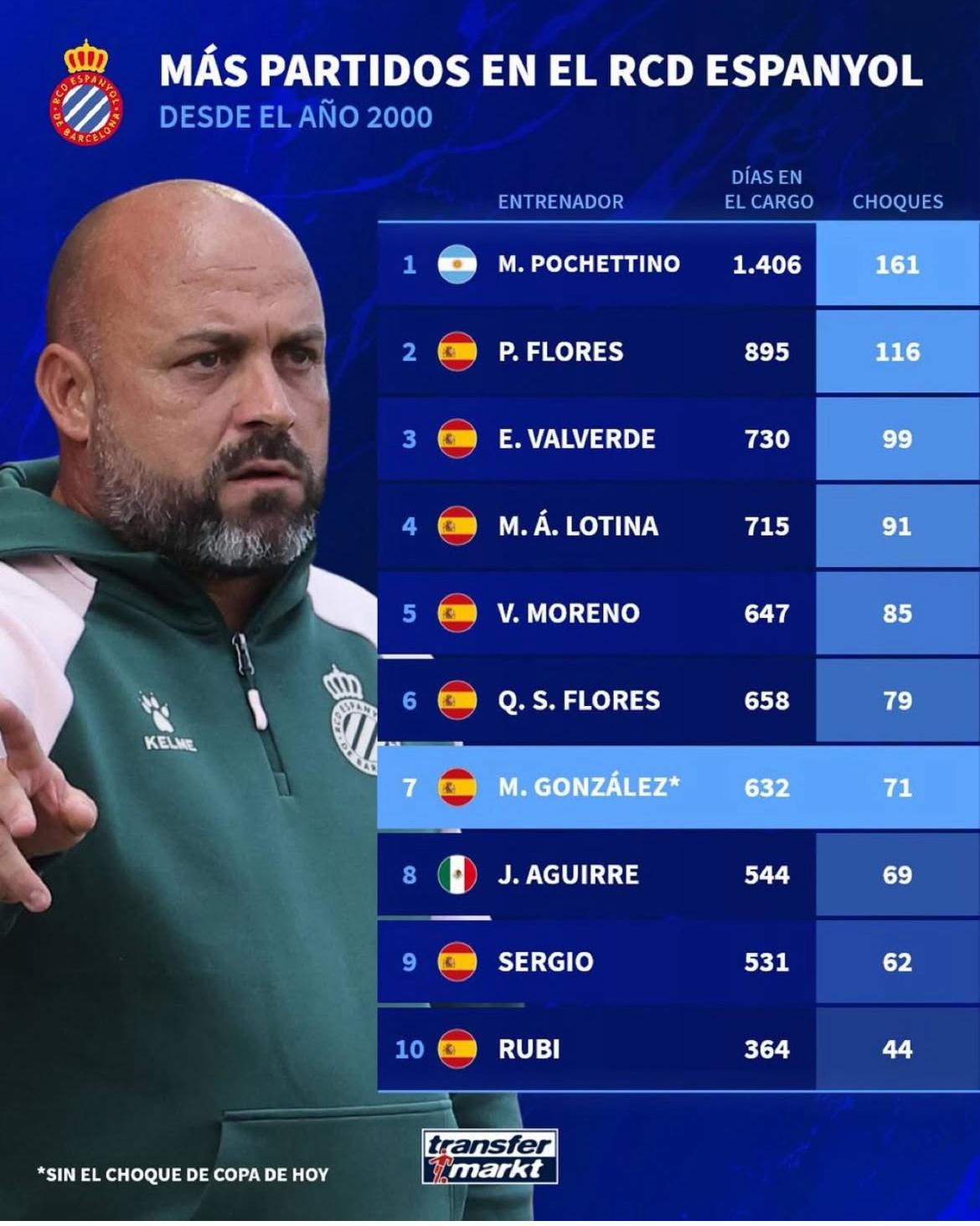 Manolo González sigue haciendo historia en silencio y con el mono de trabajo bien puesto. Con 71 partidos al frente del primer equipo ya se ha convertido en el séptimo entrenador con más encuentros dirigidos al Espanyol en este siglo XXI, según los datos de Transfermarkt. Por delante solo quedan nombres de peso como Pochettino, Paco Flores, Valverde, Lotina, Vicente Moreno y Quique Sánchez Flores. Su continuidad, lejos de ser una anécdota, empieza a colocarlo en el mapa de los técnicos más estables y reconocibles del club en las últimas dos décadas.