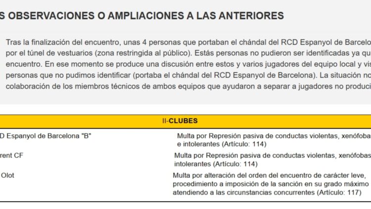 La Real Federación Española de Fútbol ha sancionado al RCD Espanyol con una multa por «represión pasiva de conductas violentas, xenófobas e intolerantes», tras los hechos ocurridos en el partido frente al filial del FC Barcelona.