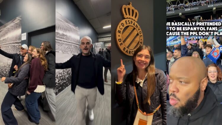 La cara más surrealista del día la puso KevOnStage, actor y comediante estadounidense con millones de seguidores, que también vivió su primer derbi… aunque con un estilo algo más caótico. Al principio del partido se le vio entre la afición del Espanyol, cantando el ya famoso “Puta Barça” y disfrutando del ambientazo de Cornellà como uno más. Hasta ahí, todo bien.