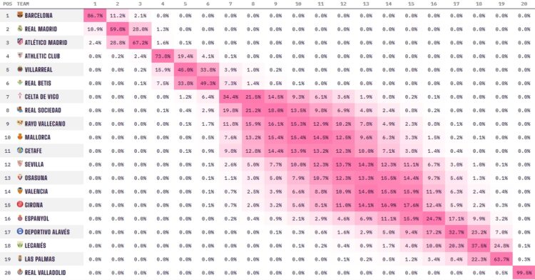 ¿Cómo se elaboran estas predicciones? El modelo de Opta combina datos del mercado de apuestas y los Power Rankings del propio sistema, que tienen en cuenta tanto el rendimiento reciente como el histórico de cada equipo. A partir de ahí, simula miles de veces todos los partidos que quedan por jugar. En esas simulaciones, se registran cuántas veces un equipo acaba en cada posición. Y con eso, se genera la proyección final.
