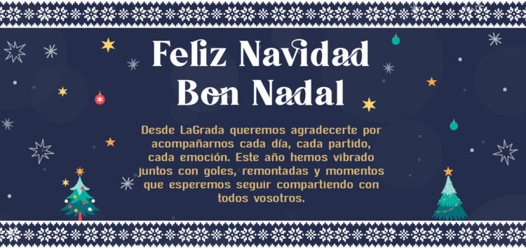 Desde el equipo de La Grada queremos aprovechar la ocasión para mandaros a todos un abrazo enorme. Que paséis unas Felices Fiestas en familia, con vuestros amigos y seres queridos… y que 2026 nos siga encontrando juntos, en victorias -que esperemos sean muchas-, derrotas -pocas- y todas esas cosas tan especiales que hacen que este club sea, por mucho que les pese a los demás, especial y único.