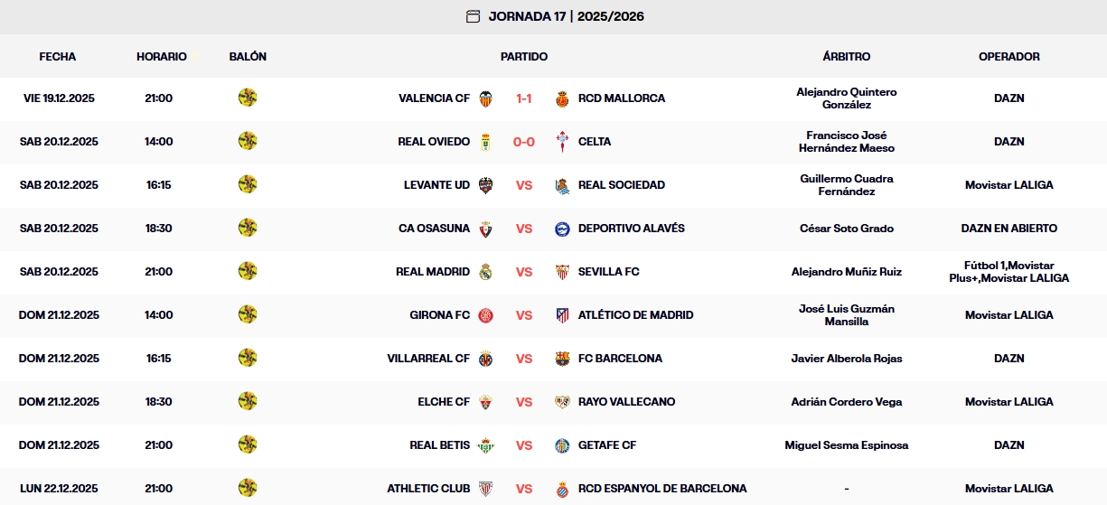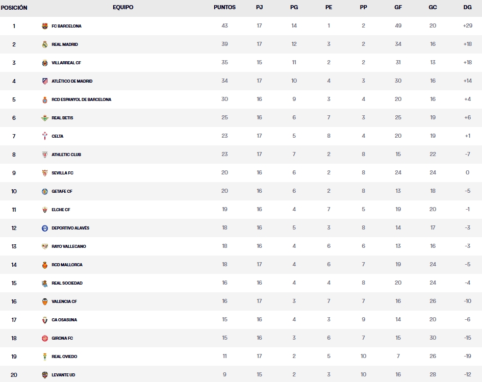 Como cada fin de semana, vamos a ir informando y actualizando los resultados, la clasificación, la crónica y los resúmenes de los partidos de la Jornada 17 de LaLiga EA Sports 25-26.