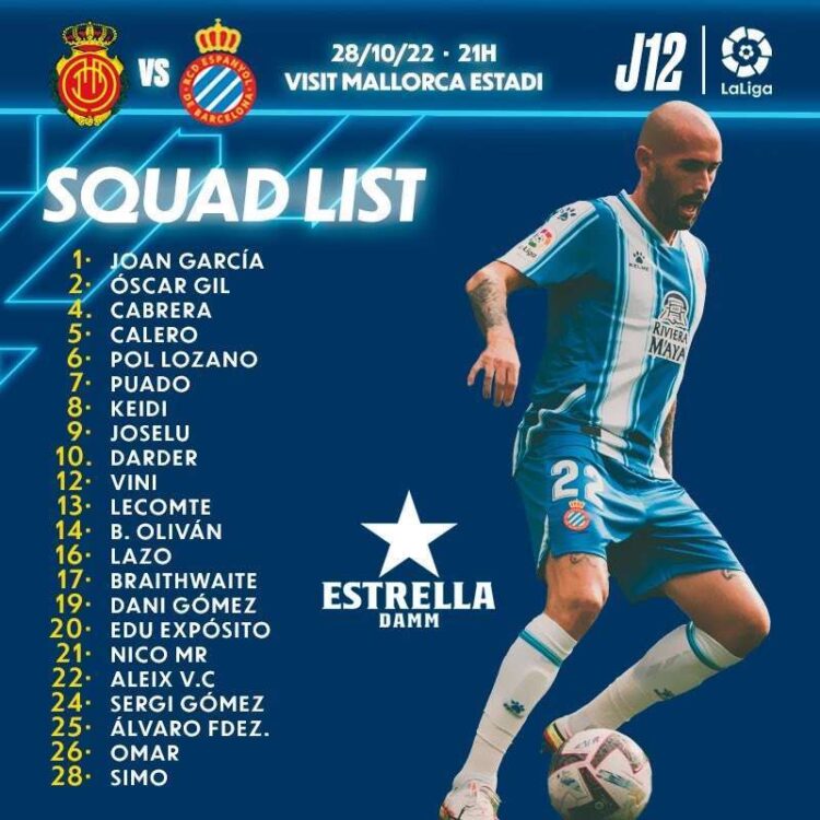 La lista completa de convocados del Espanyol para el duelo ante el RCD Mallorca es la siguiente: Joan García, Óscar Gil, Cabrera, Calero, Pol Lozano, Puado, Keidi Bare, Joselu, Sergi Darder, Vini Souza, Lecomte, Brian Oliván, Lazo, Braithwaite, Dani Gómez, Edu Expósito, Nico Melamed, Aleix Vidal, Sergi Gómez, Álvaro Fernández, Omar y Simo.