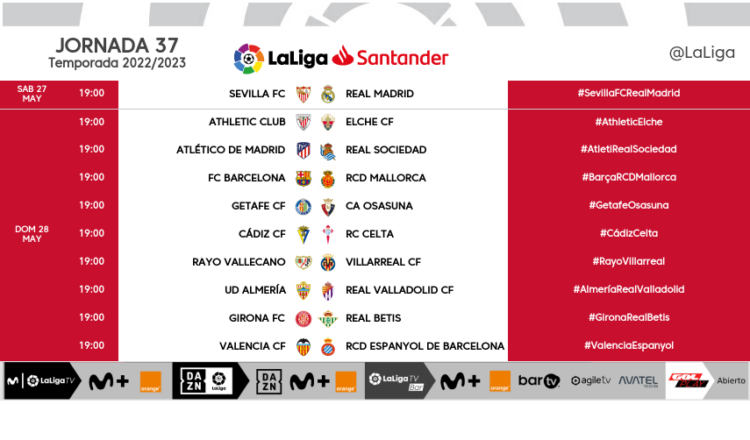 Esta jornada será sin duda clave ya que hay tres duelos directos (Valencia – Espanyol; Almería – Valladolid; y Cádiz – Celta), y en la última jornada habrá otros dos más, el Espanyol – Almería y el Valladolid – Getafe. Evidentemente, y a expensas de lo que suceda esta tarde en Mestalla, quien más fácil lo tiene ahora mismo para salvarse es el Valencia (recordemos, 40 puntos), que conseguiría el objetivo si gana al Espanyol, o empata y el Getafe y el Valladolid no ganan. El goal average general es de -3. El goal average particular lo tienen así con el resto de equipo implicados en la lucha por la permanencia: