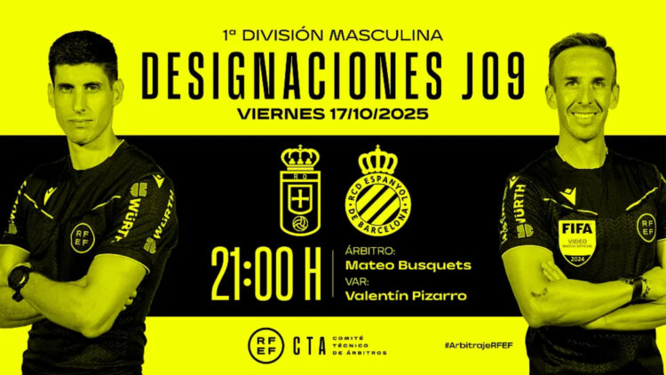 El árbitro Mateo Busquets Ferrer, nacido en Palma de Mallorca en 1993, ha sido el designado por el Comité Técnico de Árbitros para dirigir el Oviedo – Espanyol de este viernes en el Carlos Tartiere. A sus 31 años, el balear se ha consolidado como uno de los árbitros jóvenes con más proyección del fútbol español. Pertenece al Comité de Árbitros de las Islas Baleares y debutó en el fútbol profesional en agosto de 2022, en un Albacete – Burgos que terminó sin goles. Aquella temporada fue intensa: 24 partidos entre Liga, Copa y promoción, con 121 amarillas, seis rojas directas y seis penaltis señalados. Vamos, que carácter no le falta.