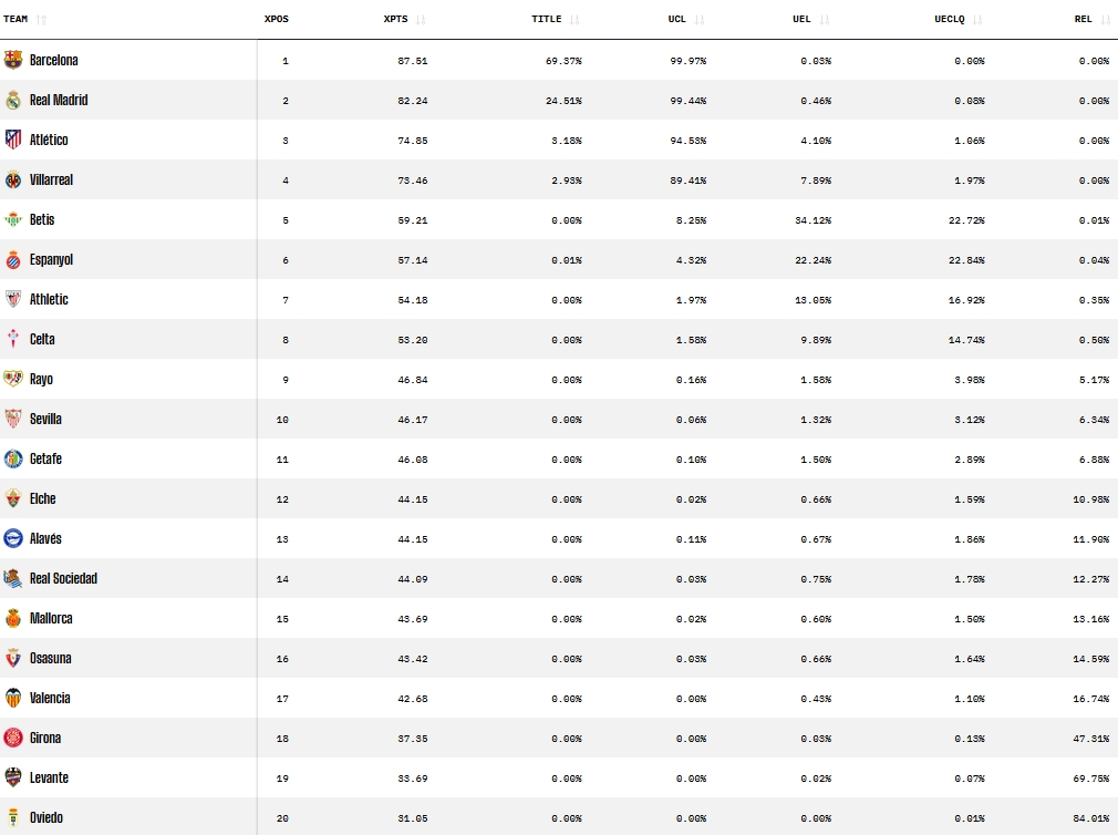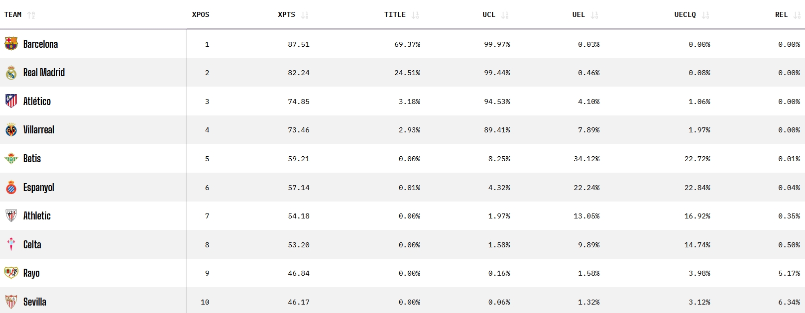 La simulación de la temporada, basada en miles de modelos estadísticos, coloca al Espanyol en la sexta posición del ranking por puntos esperados (xPTS). Solo Barça, Madrid, Atlético, Villarreal y Betis están por delante. Por detrás ya aparecen Athletic, Celta y Rayo, todos con menos proyección que el conjunto blanquiazul.