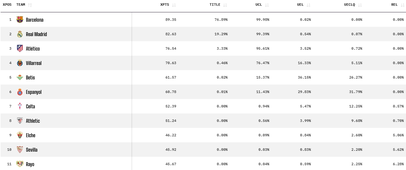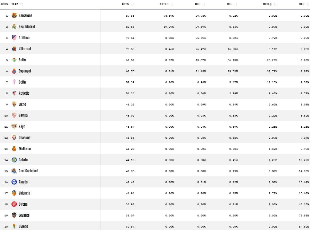 Pero aún hay más. Si además de la Copa se produce un reparto de plazas UEFA adicional (por ejemplo, una quinta plaza Champions por ránking UEFA), o si se diera el milagro de que el campeón de Copa no sea un europeo pero aun así se liberen plazas, entonces hasta el octavo podría ir a Europa. Y si eso pasa, la predicción más optimista sitúa al Espanyol con un 93,84% de opciones de clasificarse.