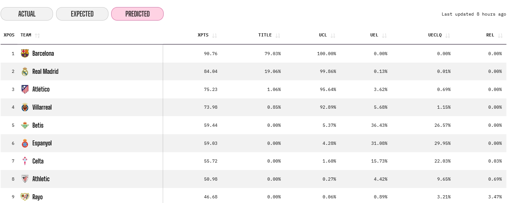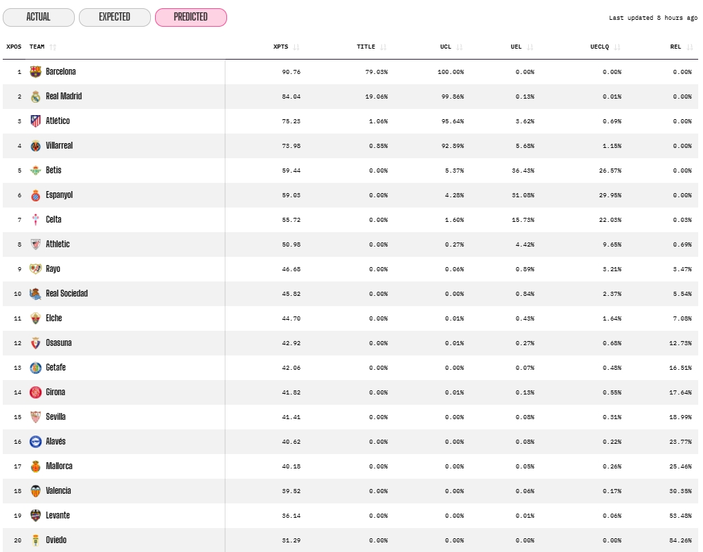 El Atlético, tercer clasificado, aparece con 75,23 puntos previstos, y el Villarreal, cuarto, con 73,98. Pero en esa pelea por la Conference y la Europa League, el Espanyol va en el vagón delantero, por delante de equipos como Celta (55,72), Athletic (50,98) o Rayo (46,68).