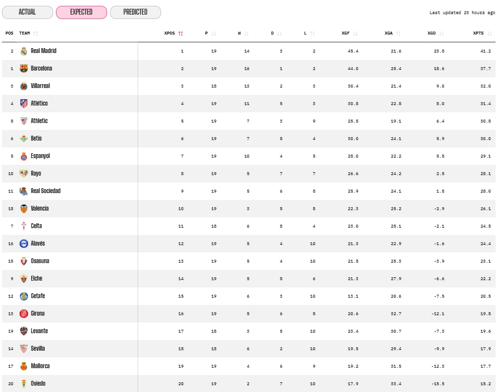 Si pasamos del futuro al presente con los llamados Expected Points (xPTS), el Espanyol también da la sorpresa. En esa tabla aparece séptimo, con 29,1 puntos esperados, muy por debajo de los 34 reales que ha sumado en el césped, y de su actual 5ª plaza.