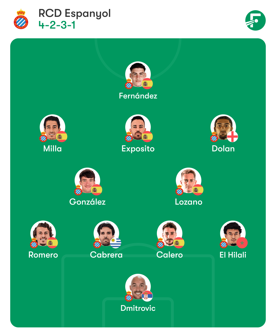 San Mamés espera al conjunto perico con un ambiente de los de antes, de partido grande. Los de Manolo González llegan lanzados, con cuatro victorias consecutivas, pero también con el reto de mantener el nivel en un campo tan exigente como el del Athletic. En la lista de convocados no hay apenas cambios respecto al partido de Getafe: sigue fuera Pickel, ya concentrado para la Copa África, y entra el canterano Ferran Gómez, al que el míster blanquiazul ha querido premiar. En defensa no se esperan sorpresas: Dmitrovic, Romero, Cabrera, Calero y Omar El Hilali forman la zaga tipo. El dilema real está en la medular, donde Urko y Pol podrían repetir como doble pivote si Manolo apuesta por el 4-2-3-1. Edu Expósito haría de enganche, con Pere Milla y Dolan en bandas. Arriba, habrá que ver si se opta por un Roberto Fernández que arrastra molestias desde Getafe o Kike García, que ya ha demostrado ser una alternativa fiable cuando le ha tocado entrar. Si Manolo González decide volver al 4-4-2, algo que no es descartable, lo más probable es que Pol Lozano se quede fuera del once. En ese esquema, el doble pivote lo formarían Urko y Edu, con Milla y Dolan en bandas. Arriba, Kike García acompañaría a Roberto para ganar presencia en el área.