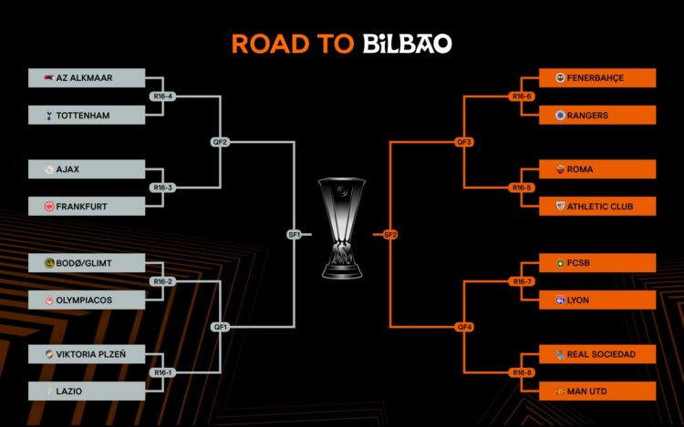 El cuadro deja por un lado al AZ Alkmaar, Tottenham, Ajax, Frankfurt, Bodo/Glimt, Olypiacos, Viktoria Plzen y Lazio. Por el otro al Fenerbahçe, Rangers, Roma, Athletic Club, FCSB, Lyon, Real Sociedad y Manchester United. Este cuadro evita una hipotética final vasca.