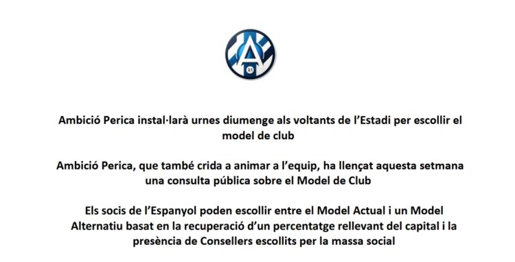 La plataforma ‘Ambició Perica’ ha puesto en marcha esta semana una consulta pública entre la afición del Espanyol. Esta consulta, en la que ya se puede votar de manera en línea, y que cuenta de momento con