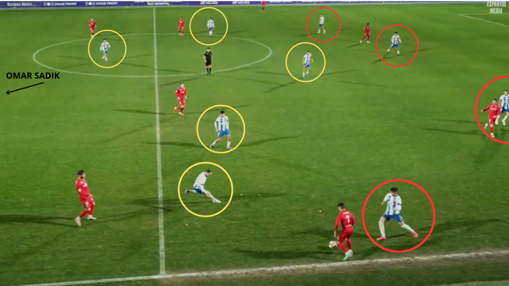 El míster perico, Manolo González, nada más empezar la segunda parte, hizo dos sustituciones para generar un cambio de estrategia. Omar Sadik -que estuvo con el primer equipo contra el Racing Club Ferrol de LaLiga Hypermotion– entró para sustituir a Aleix Gorjón y Roger Hinojo en sustitución de Ian Forns (lateral por lateral porque se pactó con el primer equipo un minutaje con el lateral izquierdo, Ian Forns, ya que también estuvo convocado con el primer equipo). Estas sustituciones hicieron que el equipo perico reestructurara la alineación, pasando de un 5-3-2 a un 4-5-1, agrupando muchos centrocampistas por medio. Además de los dos goles de Omar Sadik -en menos de 15 minutos-, gracias al cambio de estrategia se consiguió tener la pelota en toda la segunda parte, exceptuando los últimos 10 minutos, que el Hércules CF echó a todo el equipo al ataque, ya que no tenía nada que perder por ir detrás en el marcador.