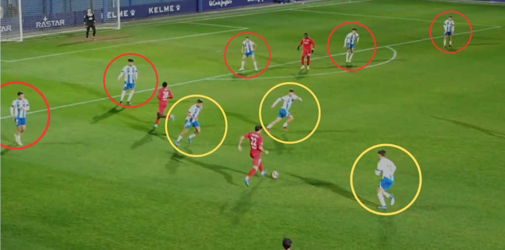 El equipo dirigido por Manolo González salió al terreno de juego con la idea clara de defender y no conceder ocasiones en la primera mitad, optando por una estrategia de 5-3-2, con Javi Hernández y Antoniu Roca en punta. Sin embargo, esto de poco sirvió porque en el minuto 11, Ketu -ariete del Hércules CF– logró robar una pelota tras un error de José Luis Català en el pase atrás. Aun así, el equipo siguió con la misma idea y eso provocó ver a un Espanyol B impreciso y más pendiente de defender que de atacar. Además, cabe mencionar que el Hércules CF hizo una gran primera mitad. Un bloque alto y compacto donde se notó la diferencia de edad entre los jugadores y la experiencia en la categoría.