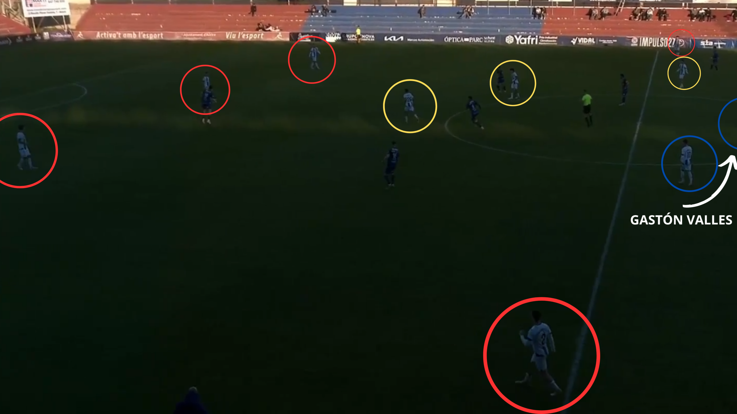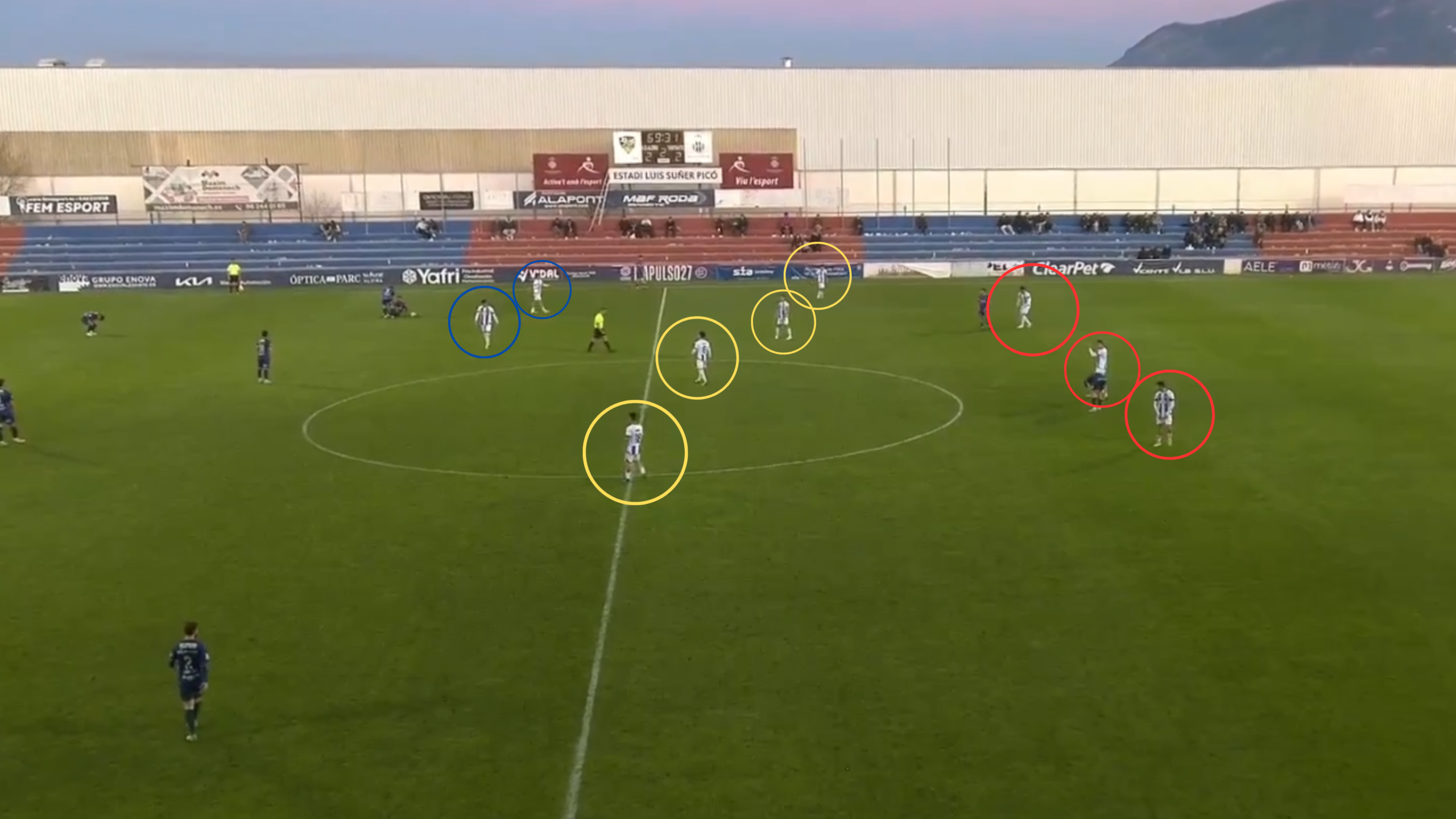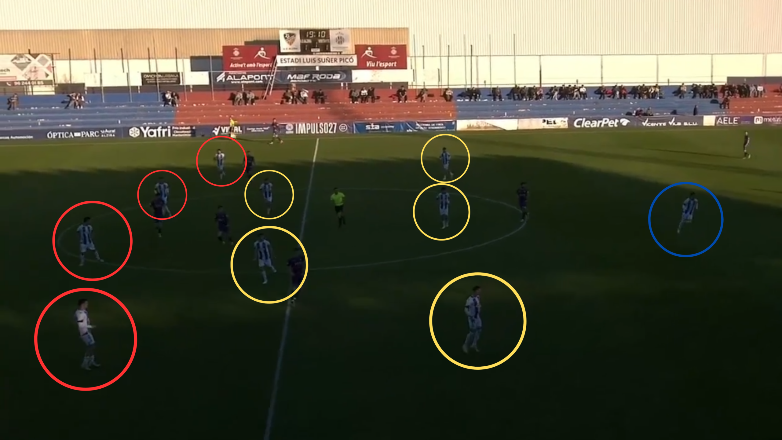 Sin embargo, tras un penalti en contra pitado -el cual está demostrado que Marc Jurado toca pelota- que acaba en gol y una jugada por banda derecha donde remata solo el ariete del UD Alzira, hacen que el equipo se vea por detrás en el marcador y cambie el estilo al habitual 3-5-2 con los laterales muy abiertos y profundos, para que, al atacar, haya muchos más frentes abiertos.