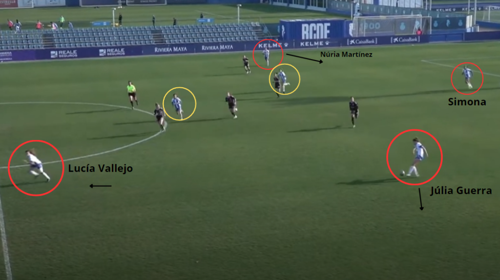 Por otro lado, se notó el trabajo realizado en los entrenamientos al ver como el Espanyol Femenino ofrecía la presión tras pérdida de pelota. El equipo generaba mucha acumulación de jugadoras en el centro del campo, obligando a Núria Mártinez (LD) a actuar más en zona defensiva como de tercer central y dando así mucha más libertad a Lucía Vallejo (LI) para hacer las subidas, ya que sabía que estaría cubierta por Júlia Guerra, la central izquierdo. Así, en muchas ocasiones, se acumulaba una gran cantidad de jugadoras pericas en la presión, recuperando fácilmente la pelota.