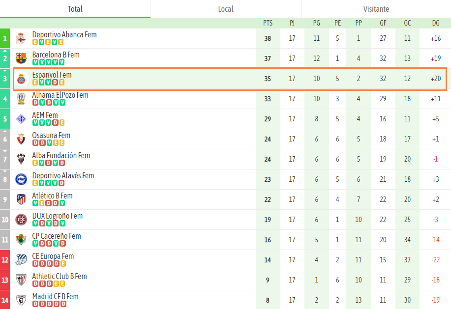 El equipo está en tercera posición en la clasificación a tres puntos del verdadero rival, el RC Deportivo Abanca