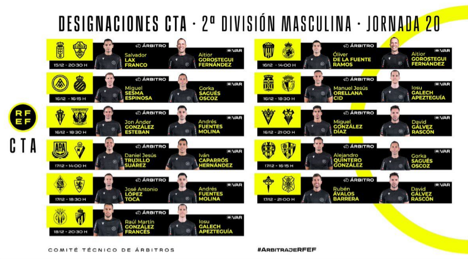 Esta mañana conocíamos que el árbitro designado por el CTA (Comité Técnico de Árbitros) para el partido correspondiente a la jornada 20 de La Liga Hypermotion entre el FC Andorra – Espanyol es el riojano Miguel Sesma Espinosa.