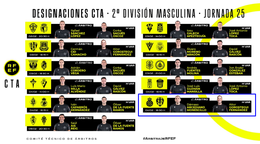 El colegiado Dámaso Arcediano Monescillo será el encargado de arbitrar el encuentro entre el RCD Espanyol y el UD Levante de la correspondiente jornada 25 de LaLiga Hypermotion.