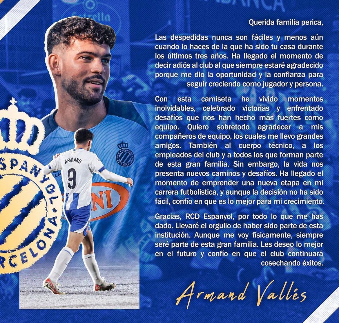 El jugador, que procedía del Real Madrid y tras dos temporadas y media en el conjunto blanquiazul, ha comunicado en sus redes sociales que deja la entidad perica, separando así sus caminos.