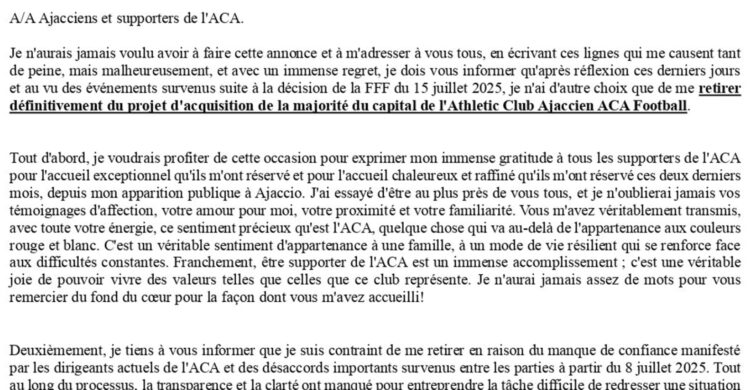 Con un tono profundamente sentido -“con inmenso pesar y escribiendo estas líneas que me causan tanto dolor”, arranca el comunicado-, Baqué explica que se ha visto forzado a dar un paso atrás por la “falta de confianza” mostrada por la actual dirección del Ajaccio, unida a “desacuerdos importantes surgidos entre las partes a partir del 8 de julio”. Asegura que durante todo el proceso ha faltado transparencia, y que la urgencia por mejorar la crítica situación financiera del club complicó aún más las negociaciones.