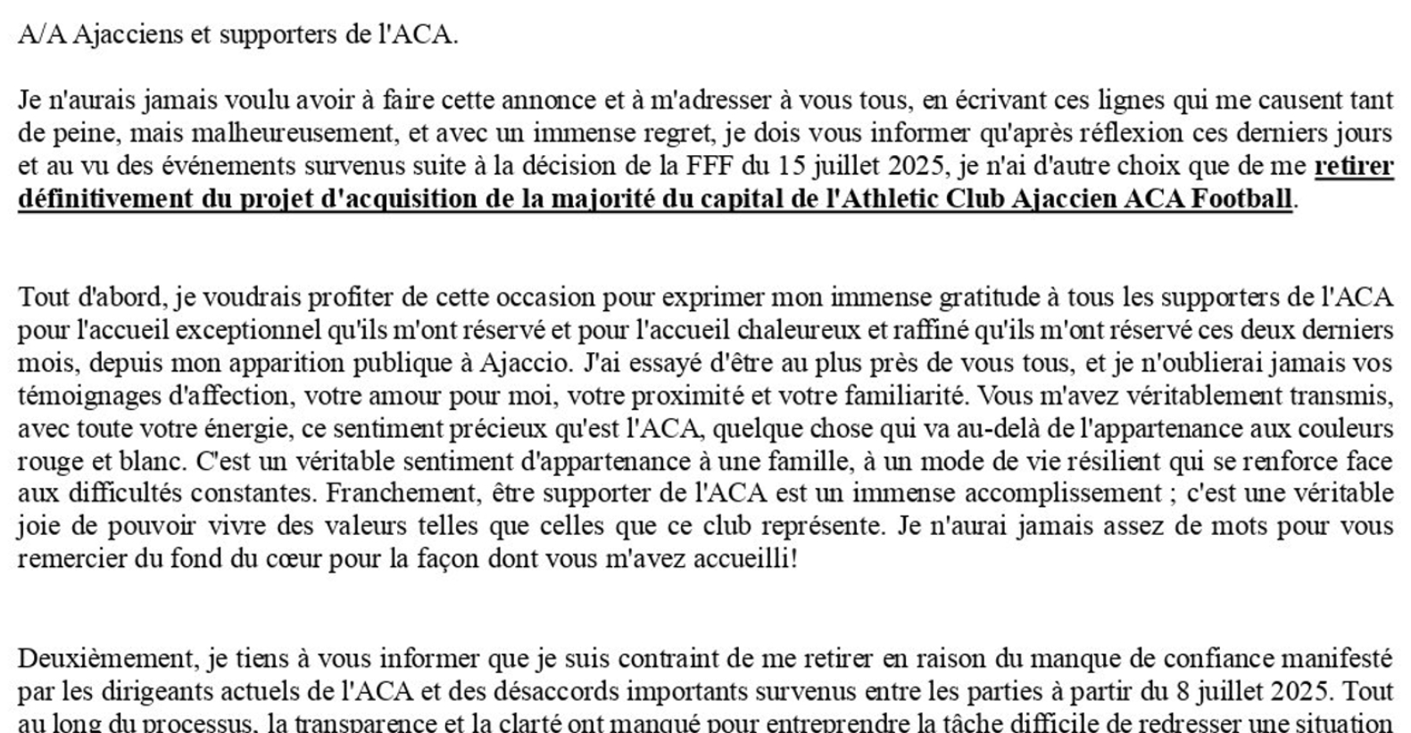 Con un tono profundamente sentido -“con inmenso pesar y escribiendo estas líneas que me causan tanto dolor”, arranca el comunicado-, Baqué explica que se ha visto forzado a dar un paso atrás por la “falta de confianza” mostrada por la actual dirección del Ajaccio, unida a “desacuerdos importantes surgidos entre las partes a partir del 8 de julio”. Asegura que durante todo el proceso ha faltado transparencia, y que la urgencia por mejorar la crítica situación financiera del club complicó aún más las negociaciones.