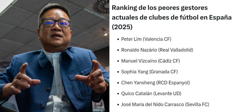 La lista no deja lugar a dudas y sitúa a Chen entre figuras que también han sido objeto de críticas por parte de sus respectivas aficiones. En primer lugar aparece Peter Lim (Valencia CF), seguido de Ronaldo Nazário (Real Valladolid), Manuel Vizcaíno (Cádiz CF), Sophia Yang (Granada CF) y, en quinta posición, el máximo accionista del club blanquiazul. Completan el listado Quico Catalán (Levante UD) y José María del Nido Carrasco (Sevilla FC). La publicación ha tenido un gran eco en redes sociales, donde los seguidores de los clubes “damnificados” por la gestión de estos dirigentes han reaccionado con una mezcla de indignación, resignación y hasta cierta ironía.