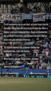 “Es el momento de la verdad, el más importante del año. Después de una temporada de altos y bajos, y somos conscientes, llega el momento de unificar fuerzas y sentimientos para llevar este escudo donde merece. Ya habrá tiempo de aclarar todas las habladurías, con verdades. Ahora solo ganar. Solo subir. Juntos. Vamos mi Espanyol”.