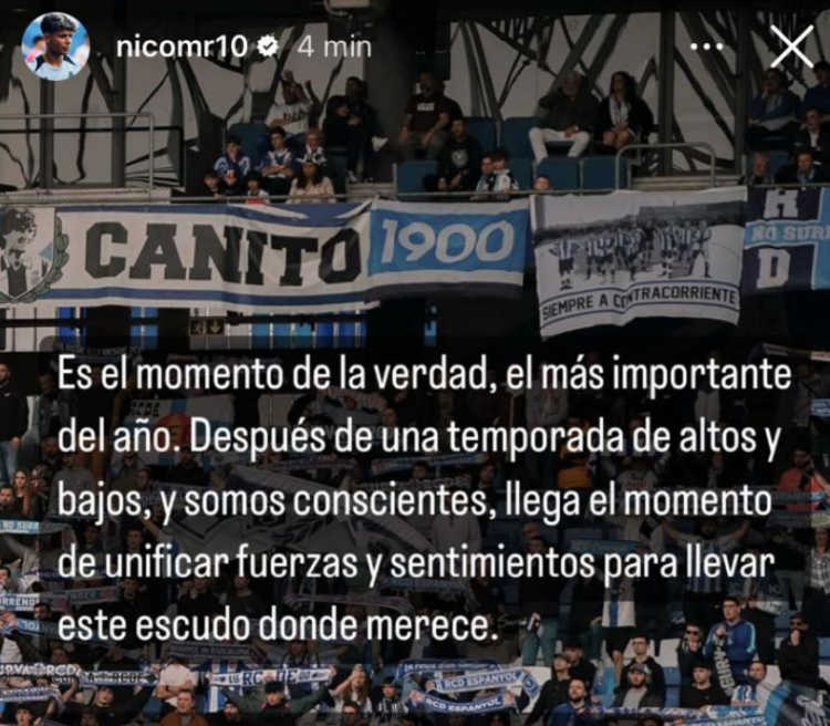 Nico Melamed no ha dejado pasar la oportunidad de dejar un mensaje en redes sociales a la afición perica antes del trascendental playoff que se avecina para el RCD Espanyol. Además, en el mensaje deja algún ‘dardo’ interpretativo para todo aquel que quiera cogerlo. El escrito dice así: