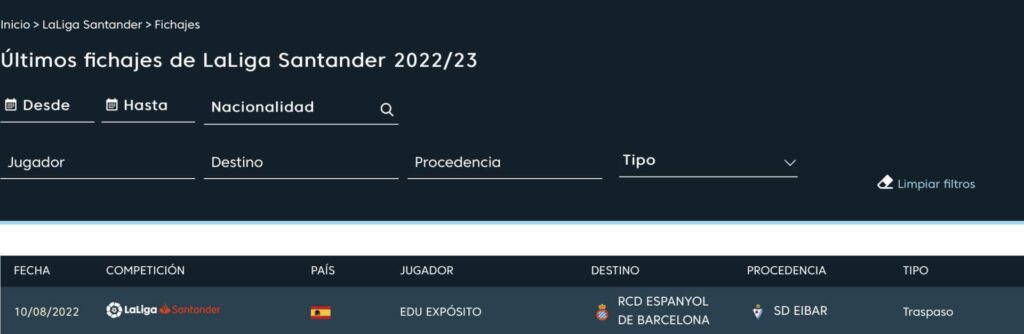 Desde primera hora de la tarde de este miércoles 10 de agosto Edu Expósito, el quinto fichaje del Espanyol en este mercado de invierno, está inscrito en LaLiga. Así figura en el portal del organizador del campeonato domestico solo un día después de ser presentado como nuevo jugador espanyolista y dos desde el anuncio de su llegada. Por tanto, el nuevo centrocampista perico ya estará disponible para debutar si Diego Martínez así lo considera en el estreno liguero contra el Celta en Balaídos.