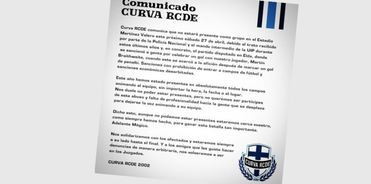 La Curva ha emitido un comunicado en que hace pública su decisión de no restar presente como grupo en el Estadio Martínez Valero este próximo sábado 27 de abril, con motivo del Elche – Espanyol, debido textualmente “al trato recibido por parte de la Policía Nacional y el mando intermedio de la UIP durante estos últimos años y, en concreto, el partido disputado en Elda, donde se sancionó a gente por celebrar un gol con nuestro jugador, Martín Braithwaite, cuando este se acercó a la afición después de marcar un gol de penalti.