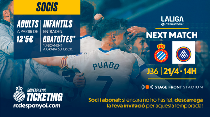 El RCD Espanyol ha lanzado una promoción de entradas para recibir la visita del FC Andorra de la jornada 36 de LaLiga Hypermotion, que será este domingo a las 14 horas en el Stage Front Stadium.