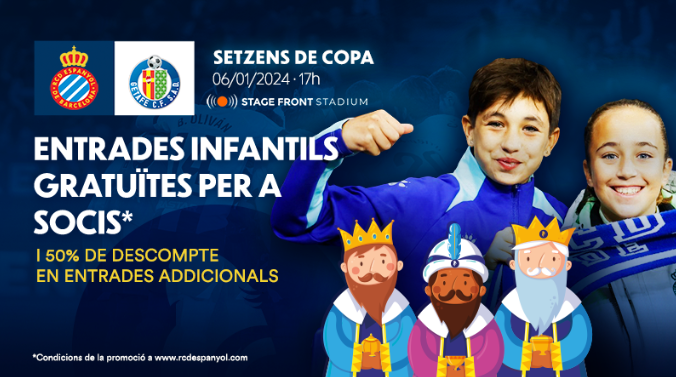 El RCD Espanyol realiza una promoción de entradas exclusiva para los socios del RCDE. Cada socio podrá retirar entradas infantiles -pero cuidado, porque el club avisa que se pedirá el documento acreditativo en los aledaños del Stage Front Stadium– hasta acabar con las existencias (niños/as hasta los 15 años de edad).