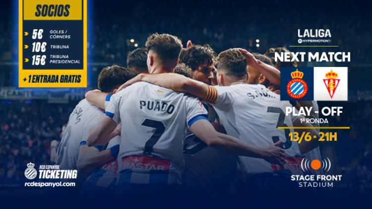 El Espanyol pone en marcha una promoción de entradas para el partido contra el Sporting de Gijón del jueves 13 de junio a las 21:00 horas en el Stage Front Stadium, correspondiente a la vuelta de la primera eliminatoria del playoff de ascenso a Primera división, al cual se podrá acceder con el abono de la temporada 2023-24. Ésta es la promoción dirigida enexclusiva para todos los socios y socias: