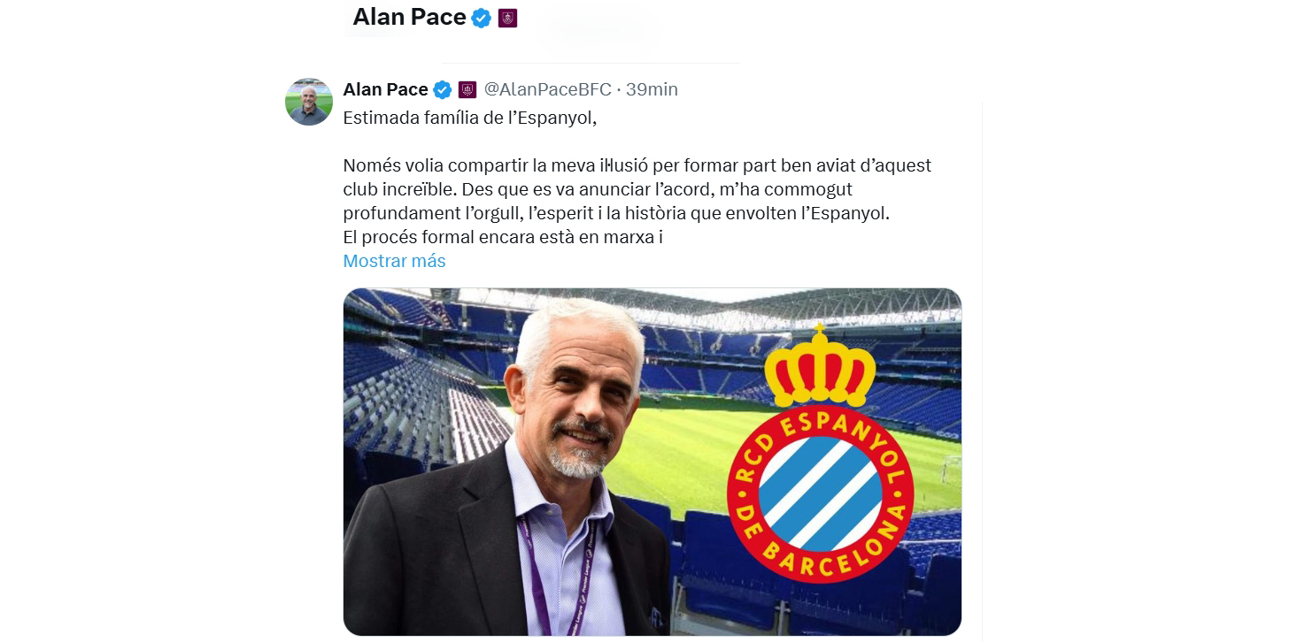 El propio Pace quiso mandar este sábado un mensaje a la afición perica para romper el hielo. Y lo hizo con una carta sencilla, pero bien medida: en inglés, sí, pero también en catalán. “Només volia compartir la meva il·lusió per formar part ben aviat d’aquest club increïble”, soltó en X. Luego aclaró que el proceso de compra aún no ha terminado: “Tengo que esperar un poco más antes de unirme a vosotros en este increíble viaje”, y explicó que su silencio hasta ahora no era por desinterés, sino por respeto. El broche fue tan perico como necesario: “Força Màgic Espanyol”.