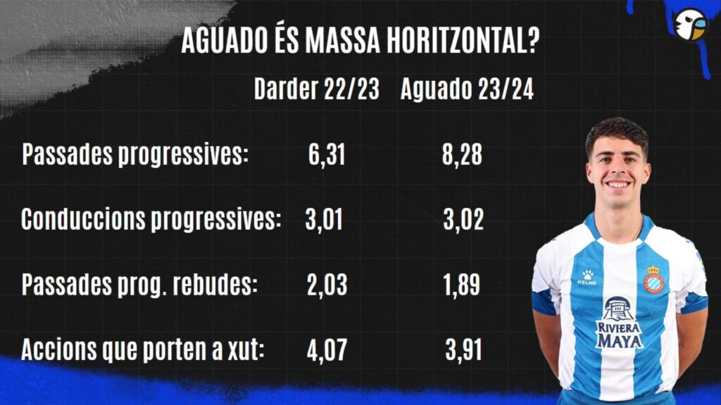Nuestro analista de cabecera, Àlex Cobas, ha traído a su sección un fragmento del podcast de ‘Offsiders’ donde Sara Carmona, especialista en tratamiento de datos en ‘Relevo’, expone tras analizar los datos del centrocampista del Espanyol Álvaro Aguado unas características muy destacadas tanto en intensidad como en producción de juego. Cobas ha insistido en los pases progresivos, los que hacen avanzar al equipo en el campo; los cambios de orientación y lo que aporta a nivel de músculo, mostrando a través de unos gráficos como sus números no están tan alejados de un referente como fue Sergi Darder, un futbolista considerado mucho más vertical, en la pasada temporada, si bien es cierto que parte de una zona más baja en el campo que el de Artà.