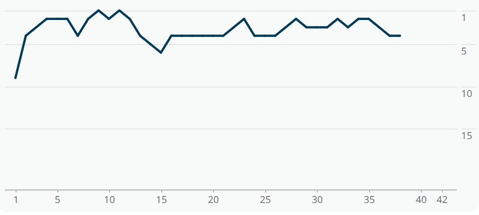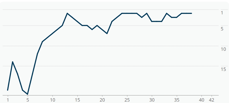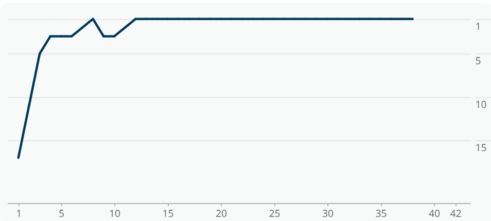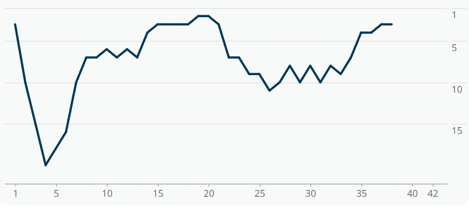 El Valladolid, actual colíder, comenzó el curso siendo tercero, pero inició una dinámica descendente que le llevó al puesto 20 en la cuarta jornada. Posteriormente fue remontando hasta que en la jornada 14 volvía al top 6, aunque lo abandonaría en la 22 y no volvería a él hasta fecha reciente, la jornada 35. Ya no lo ha abandonado, aunque nunca ha alcanzado el puesto 1 de la clasificación.