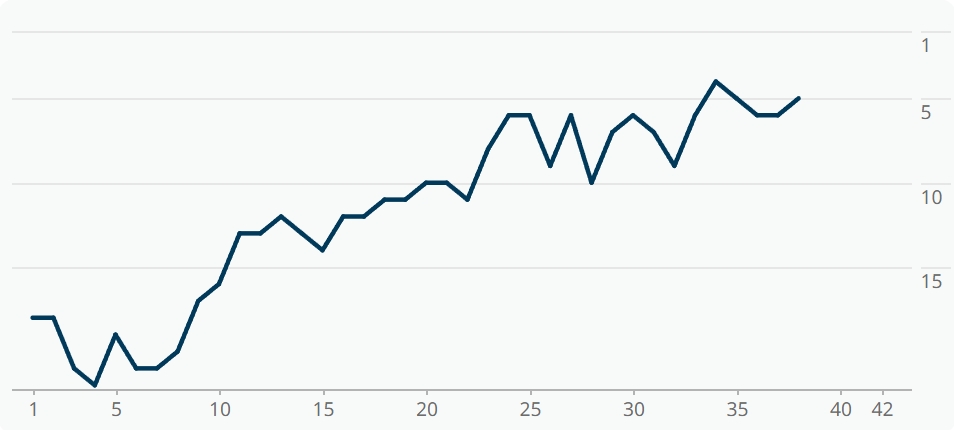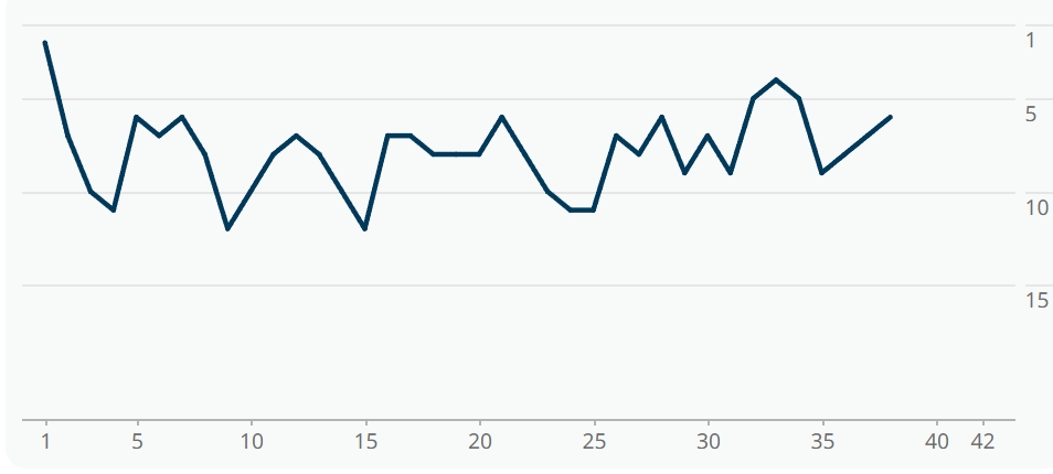 El actual 5º clasificado, el Oviedo, no pisó por primera vez el top 6 hasta la jornada 24, y ha estado entrando y saliendo del mismo en una trayectoria de dientes de sierra.