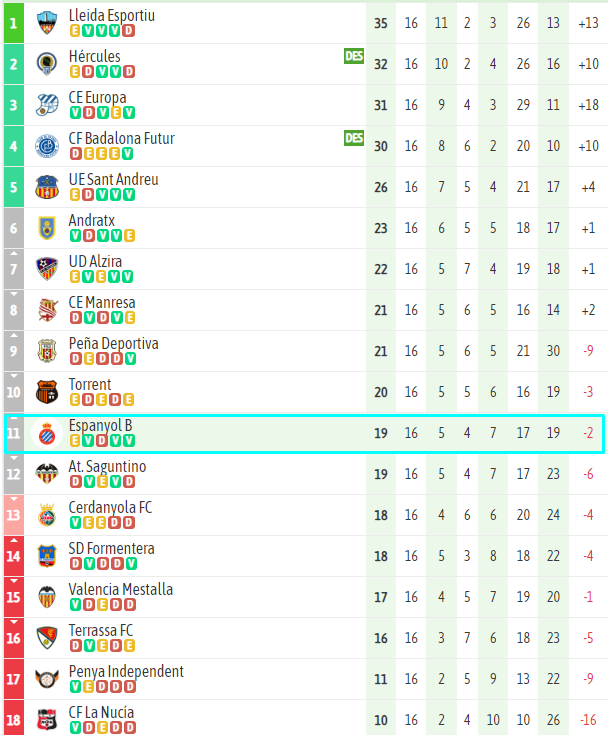 Los blanquiazules duermen fuera del descenso durante las fechas navideñas. Los pupilos de Manolo González consiguen la posición 11 en la tabla con 19 puntos y ya no deben mirar más para abajo. Ahora la idea es luchar por acercarse a esos puestos de play off que están a siete puntos -lo marca la UE Sant Andreu con 26 puntos-. El conjunto perico volverá a por esos objetivos el 6 de enero –día de reyes– contra el CE Europa.
