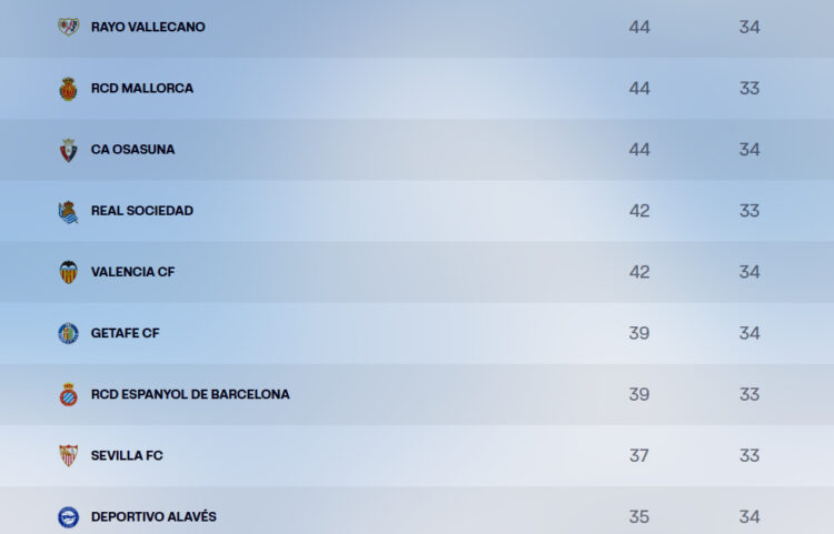 Los rivales por esa codiciada octava plaza están ahora mismo en un puñado de puntos: Rayo (44), Mallorca (44), Osasuna (44), Real Sociedad (42), Valencia (42) y el propio Espanyol (39). Todos tienen calendarios complicados y duelos directos entre ellos. El Rayo aún debe enfrentarse a Betis, Celta y Mallorca; el Mallorca visitará al Real Madrid; Osasuna recibirá al Espanyol en la penúltima jornada; y la Real Sociedad se juega buena parte de sus opciones inmediatas ante el Athletic en un derbi vasco decisivo.