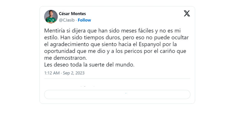 El nuevo jugador de la UD Almería César Montes ha aprovechado sus redes sociales para despedirse del Espanyol y de sus aficionados. En un mensaje lacóbico, de apenas cuatro líneas, ha reconocido que ha pasado unos meses complicados y tras agradecer la oportunidad que le brindó hace unos meses el Espanyol de dar el salto a Europa, desea “toda la suerte del mundo” a los pericos.