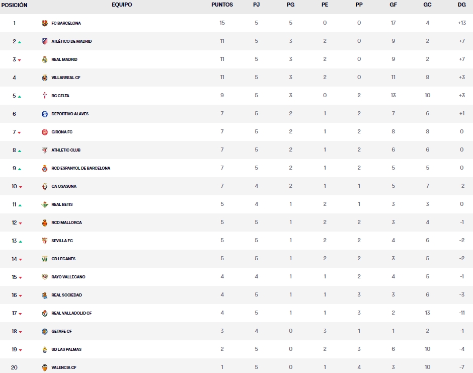 La quinta jornada de LaLiga EA Sports 2024-25 ha deparado una serie de partidos que están empezando a marcar el rumbo de la temporada. Por lo que respecta al Espanyol cerró su partido ante el Alavés en el RCDE Stadium con un marcador final de 3-2. A pesar de que el Alavés estuvo cerca de lograr la remontada en dos ocasiones gracias a los goles de Tomás Conechny y Nahuel Tenaglia, el triplete de Javi Puado le aseguró la victoria al Espanyol en casa. El equipo blanquiazul acaba el domingo 9º, quedando a la espera del resultado del Rayo – Osasuna que cierra esta quinta fecha del calendario para saber cómo se sitúa finalmente en la tabla.