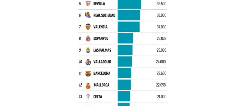 Las consecuencias de la mudanza temporal del FC Barcelona al Estadi Olímpico de Montjuic han sido notables en el número de socios que renuevan su abono. La capacidad reducida del recinto y la lejanía de las instalaciones han mermado el compromiso con sus colores de una significativa parte de la afición culé. Aunque el Barcelona ha logrado sumar 5.000 abonados más en comparación con el curso 2023-24, sigue estando muy por debajo de los grandes clubes de LaLiga y fuera del top 10, ocupando la 11ª posición.