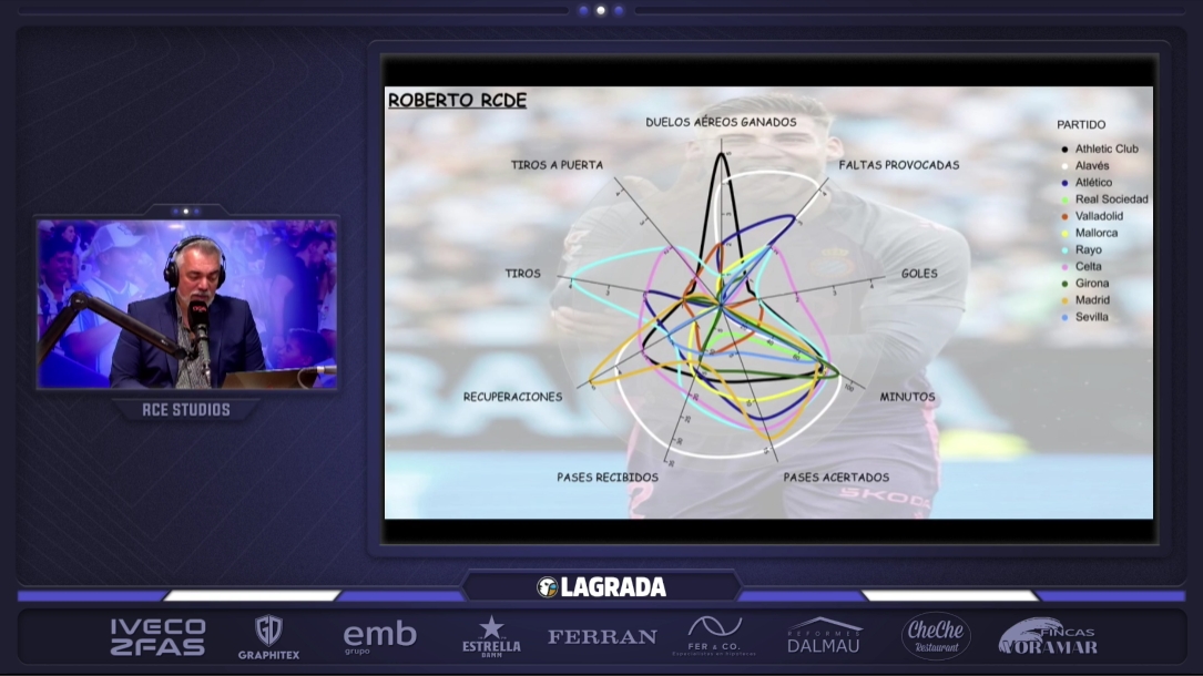 Àlex Cobas ha centrado hoy su sección en La Grada Ràdio en Roberto Fernández, analizando su rendimiento con la ayuda de un gráfico elaborado por Rai Amado. En él se muestran algunas de sus estadísticas más destacadas en los partidos donde ha brillado, y la diferencia es clara: cuando está bien, sus números en presión, duelos y recuperaciones se disparan.
