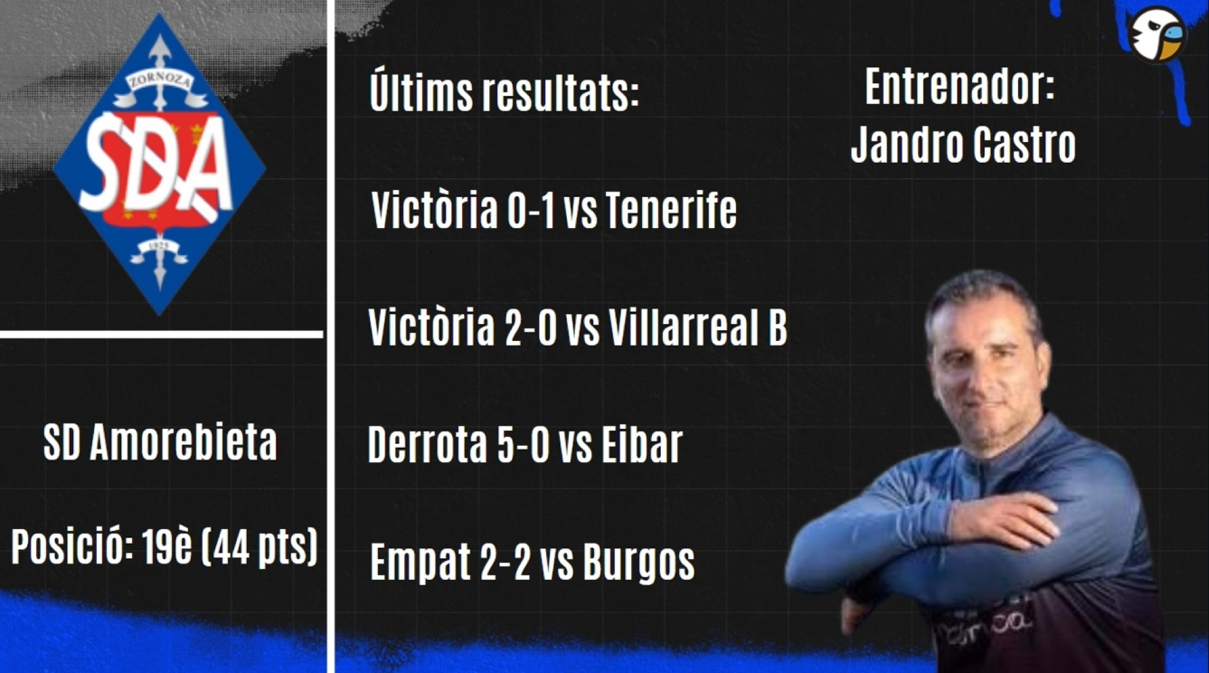 Nuestro analista, Álex Cobas, ha realizado su habitual sección, donde nos ha traído la información sobre los últimos resultados del equipo dirigido por Jandro Castro. En los cuatro últimos resultados, se han saldado con dos victorias, una derrota y un empate. Eso sí, cabe mencionar que la derrota fue muy abultada -5-0- y, casualmente, contra uno de los equipos con el que el Espanyol se pelea por el ascenso directo, la SD Eibar. El Amorebieta está en 19ª posición en la clasificación de la Liga Hypermotion con 44 puntos y se juega la vida, por lo que será un fortín y los jugadores de Manolo González tendrán que ir a Lezama a sudar sangre para traerse los tres puntos al Stage Front Stadium.