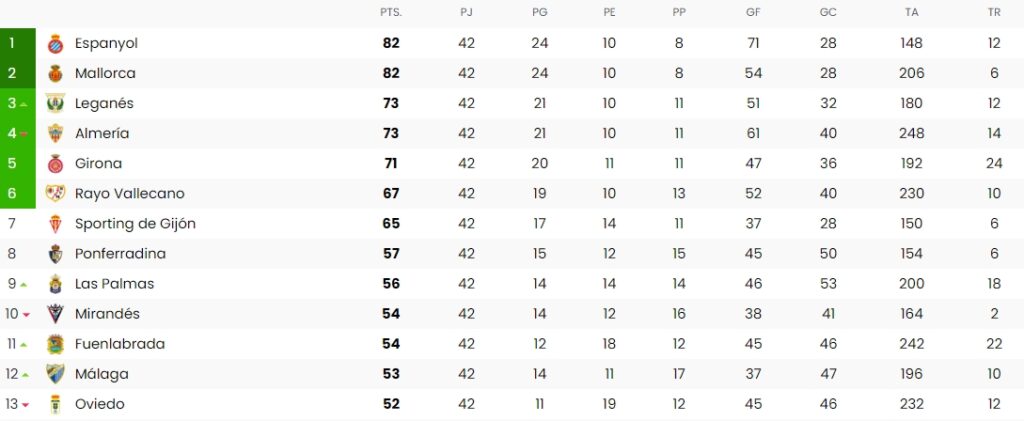 Por encima del Espanyol estaban el Mallorca con 60 puntos -el actual líder, el Leganés, suma 50, diez menos- y el Almería, con 55, uno más que los pericos. Eso sí, hay una diferencia significativa: ahora con Ramis el 7º clasificado, el primero que queda fuera de playoff, tiene sólo 4 puntos menos que el Espanyol. El año del de Massanassa, el RCDE tenía respecto a la 7ª plaza 12 puntos, un margen notablemente mayor.