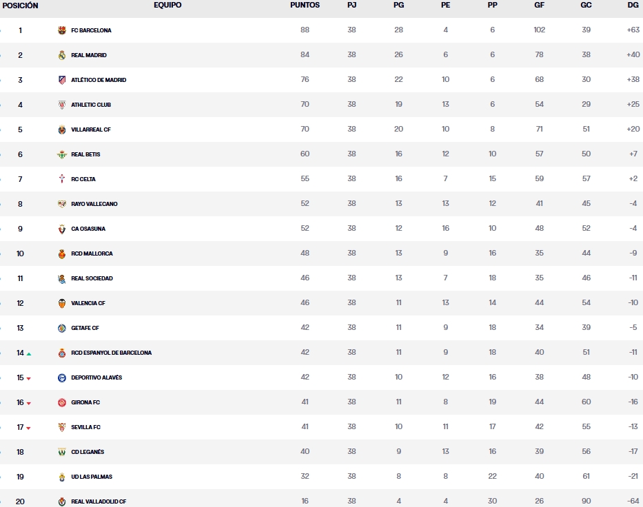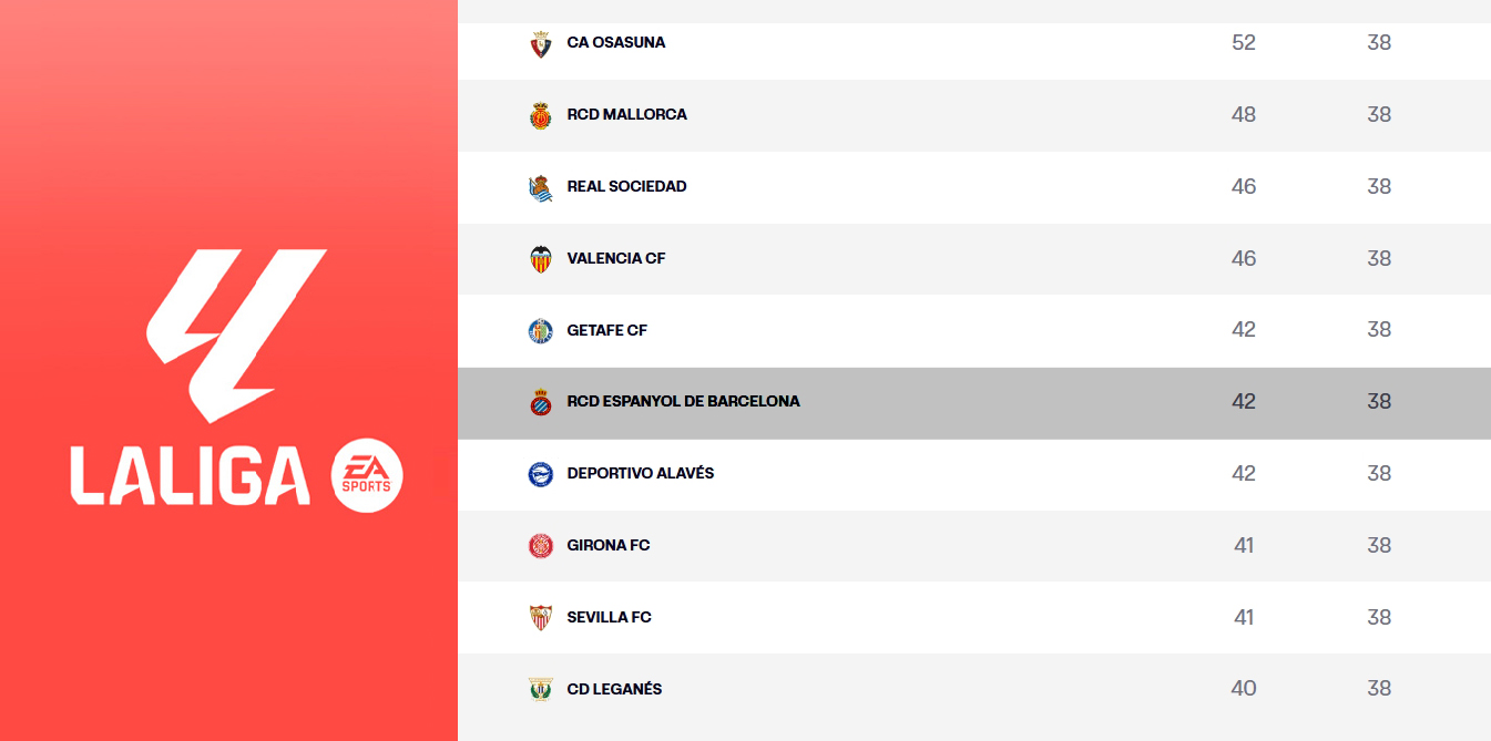 El desenlace, sin embargo, fue favorable y permitió al Espanyol escalar hasta la 14ª plaza, superando en el sprint final a rivales como Girona, Sevilla y Alavés. Este último quedó igualado a puntos, pero con un coeficiente goleador particular inferior al de los pericos, lo que ha resultado determinante. Solo el Getafe, también con 42 puntos, ha terminado por encima gracias a un mejor balance general.