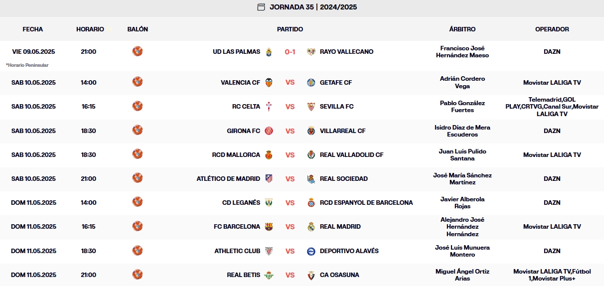Entre este viernes 9 de mayo y el domingo 11 se disputa la jornada 35 de LaLiga EA Sports, que no tendrá partido el lunes, pues la próxima semana se disputará la jornada 36 entre semana y la jornada 37 el fin de semana, con horario unificado el domingo. Una fecha que promete emociones fuertes, con partidos que pueden decidir desde el título hasta la permanencia.